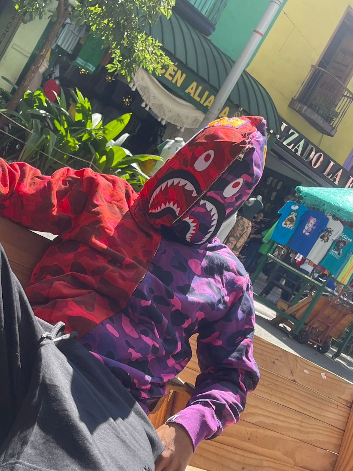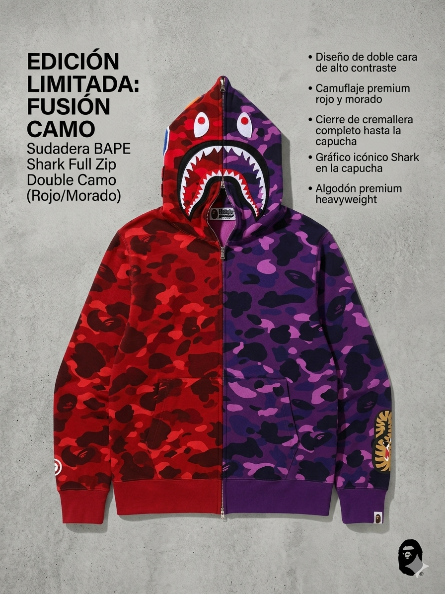 Diseño Split-Color de Alto Contraste: El cuerpo principal presenta un diseño dividido verticalmente por el centro. Un lado luce el legendario camuflaje BAPE en rojo carmesí profundo con patrones más oscuros, mientras que el otro lado presenta el camuflaje morado intenso con toques lavanda y negro, creando un contraste dramático que captura la atención desde cualquier ángulo.