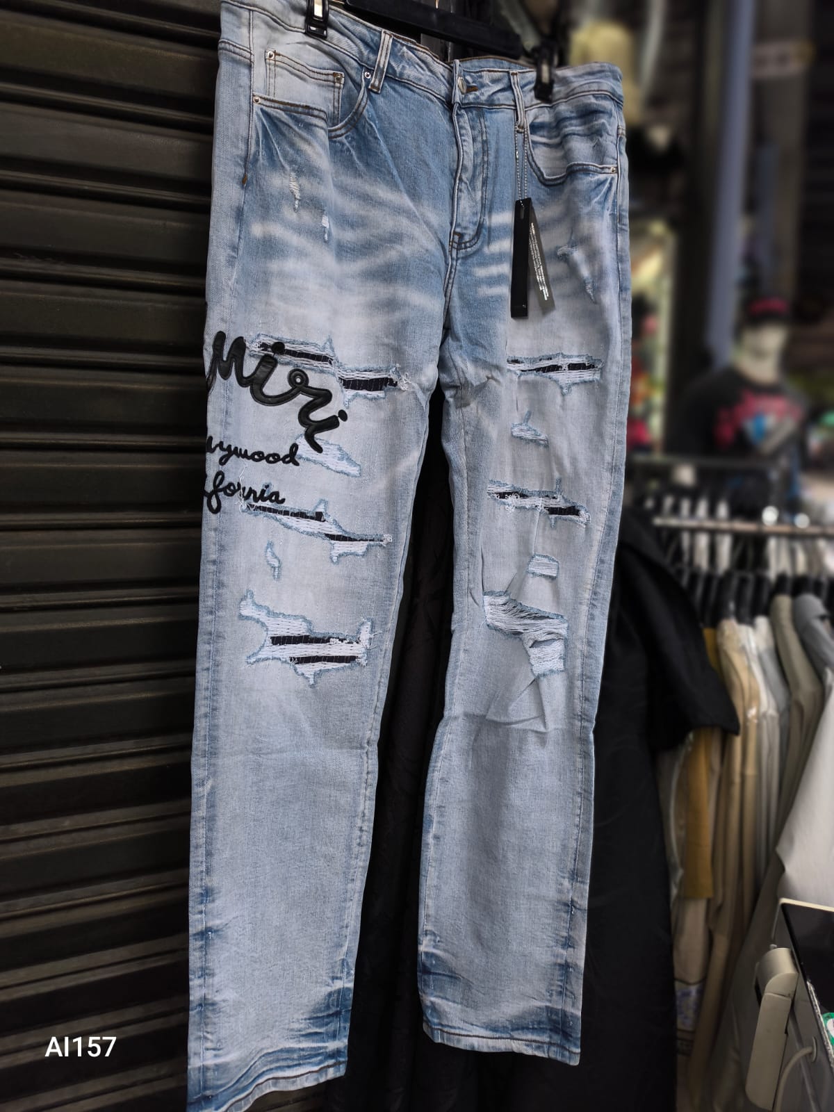 Jeans Premium “Hollywood Script” con Parches de Contraste Define tu estilo urbano con estos jeans azul claro de lavado vintage. Destacan por su diseño distressed con roturas reforzadas internamente en negro y un exclusivo bordado tipográfico en cursiva en la pierna. Confeccionados con materiales resistentes y un ajuste estructurado para máxima durabilidad y confort.